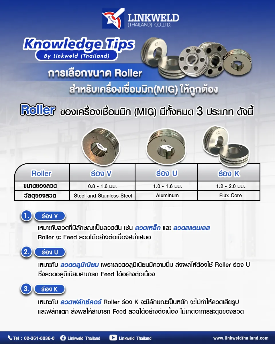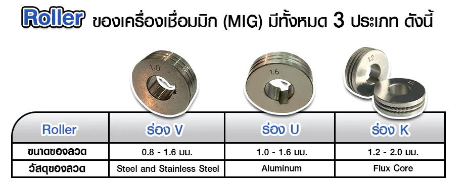 - ร่อง K – เหมาะกับ ลวดฟลักซ์คอร์ Roller ร่อง K จะมีลักษณะเป็นหยัก จะไม่ทำให้ลวดเสียรูป และฟลักแตก ส่งผลให้สามารถ Feed ลวดได้อย่างต่อเนื่อง ไม่เกิดอาการสะดุดของลวด