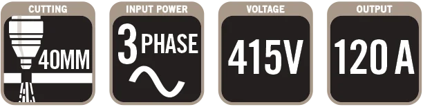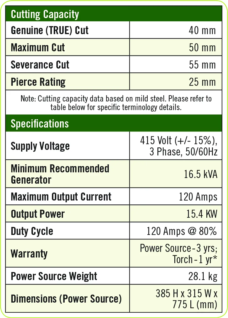 VICTOR Thermal Dynamics Cutmaster 40 plasma is the largest air cooled system manual system in the range. The heavy duty inverter system with a duty cycle of 80% in a 40°C ambient, is specifically designed for high level applications requiring superior endurance and cutting performance. Operating from a 415V three phase supply, the unit incorporates features such as auto-pilot re-start, True Guard™ roll bar and the heavy duty SL100™ 1Torch® for superior performance. The unit can also be used for heavy duty gouging, piercing and beveling applications when fitted with the correct torch consumables.