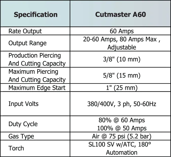 เครื่องตัดพลาสม่า VICTOR Thermal Dynamics Cutmaster A60 พร้อมหัวตัด (1-5134-1) สร้างมาตรฐานด้านความยืดหยุ่น ความทนทาน และประสิทธิภาพ พร้อมก้าวสู่ระบบ Cutmaster อัตโนมัติแห่งยุคใหม่ ดีไซน์กะทัดรัด น้ำหนักเบา และขาจับที่สะดวก ช่วยให้ติดตั้งได้ง่ายในทุกการใช้งาน วงจรการทำงานที่ทรงพลัง 80% ช่วยให้สามารถตัดชิ้นงานได้ตลอดทั้งวันในสภาพแวดล้อมที่ยากลำบาก เครื่องตัดพลาสม่ารุ่น A-Series ใหม่ประกอบด้วย SL100 SV 1Torch พร้อมระบบตัดแบบ ATC Quick Disconnect มาตรฐานความยาว 25 ฟุต เทคโนโลยีสตาร์ท 1Torch ช่วยขจัดสัญญาณรบกวนทางอิเล็กทรอนิกส์ที่อาจเกิดขึ้นกับเครื่องตัดพลาสม่ารุ่นอื่นๆ 1Torch ให้การสตาร์ทที่รวดเร็วและเชื่อถือได้ พร้อมอาร์กนำร่องที่แข็งแกร่งสำหรับเจาะแผ่นโลหะหนัก ด้วยระบบรีสตาร์ทอัตโนมัติ จึงสามารถตัดโลหะขยายตัวได้อย่างรวดเร็วและง่ายดาย ด้วยข้อดีทั้งหมดของ 1Torch และความน่าเชื่อถือของ Cutmaster ที่ได้รับการพิสูจน์แล้ว เครื่องตัดพลาสม่ารุ่น A-Series อัตโนมัติรุ่นใหม่นี้จึงมอบประสิทธิภาพการทำงาน ความแม่นยำ และประสิทธิภาพที่ดีที่สุด