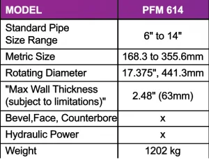 TRI TOOL PFM 614 เป็นเครื่องมือกลแบบพกพาติดตั้งแบบ OD สำหรับการตัดเฉียงและปาดผิวท่อขนาด 6 นิ้ว (168.3 มม.) ถึง 14 นิ้ว (355.6 มม.) เครื่องนี้สามารถตัดท่อที่มีขนาดถึง 4 นิ้ว (ผนังบาง) ด้วยเครื่องมือพิเศษ เครื่องมือนี้ประกอบด้วยมอเตอร์ไฮดรอลิกขับเคลื่อนคู่ที่ขับเคลื่อนด้วยชุดเฟืองเกลียวที่ติดอยู่กับแกนหมุนหลัก กระบอกสูบไฮดรอลิกแบบป้อนอัตโนมัติพร้อมระบบควบคุมการป้อนแบบเร็วและช้าช่วยให้ควบคุมหัวตัดได้อย่างแม่นยำ ชุดหัวจับแบบ OD ที่ทำงานด้วยระบบไฮดรอลิกพร้อมแผ่นรองยึด ครอบคลุมเครื่องมือทั้งหมด