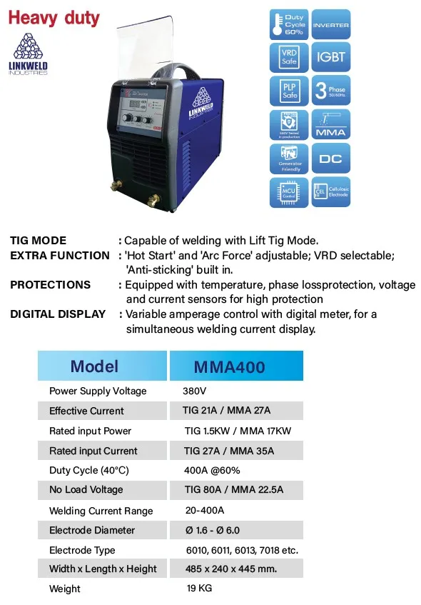 - กระแสเชื่อมออกเต็ม 400A ต่อสายเชื่อมได้ยาว100m